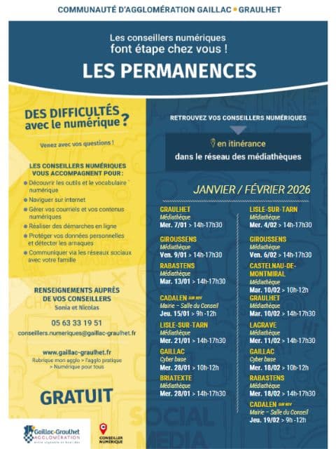 D’autres permanences sont également proposées dans les médiathèques et lieux partenaires de l’agglomération, notamment à Graulhet, Lisle-sur-Tarn, Rabastens, Gaillac, Briatexte, Lagrave, Castelnau-de-Montmiral et Cadalen, selon un calendrier défini pour les mois de janvier et février 2026 .