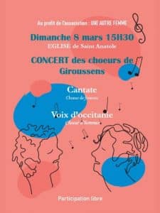 À l’occasion de la journée du 8 mars, l’église Saint Anatole accueillera un concert réunissant les deux chœurs de Giroussens. Le chœur de femmes Cantate et le chœur d’hommes Voix d’Occitanie proposeront un programme varié, fruit de leur travail et de leur engagement au sein de la commune.