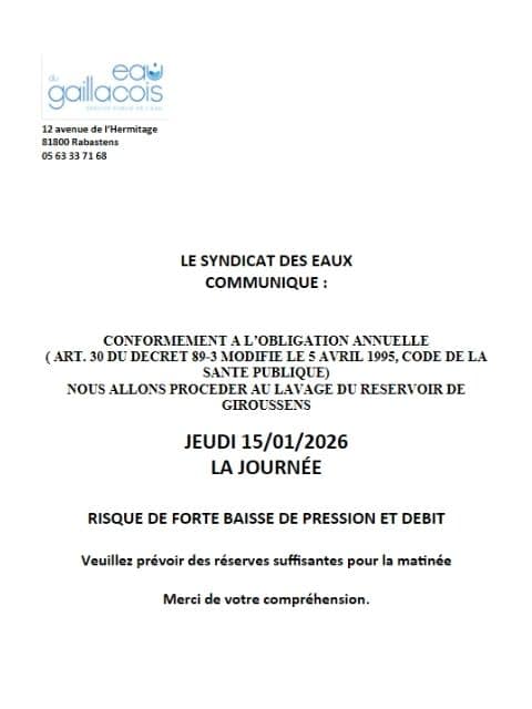 Le Syndicat des Eaux informe que, conformément à l’obligation annuelle prévue par l’article 30 du décret 89-3 modifié le 5 avril 1995 (Code de la Santé Publique), une opération de lavage du réservoir de Giroussens sera réalisée le jeudi 15 janvier 2026 au cours de la journée.